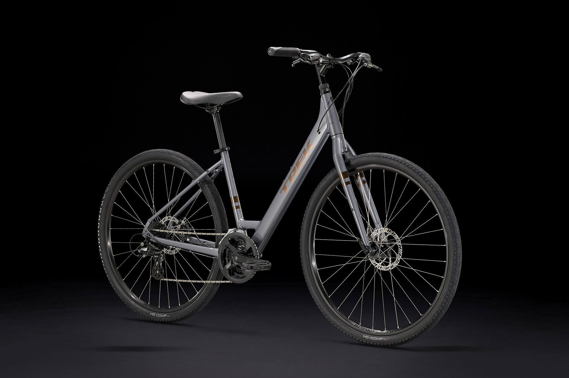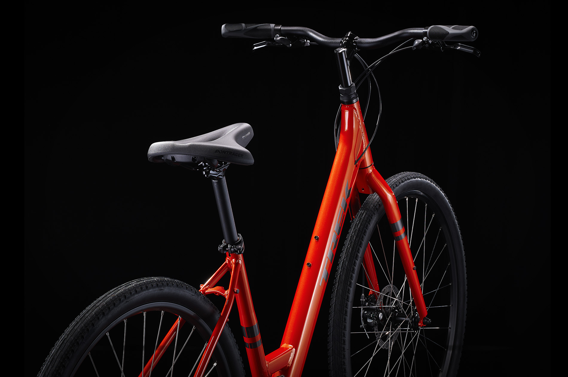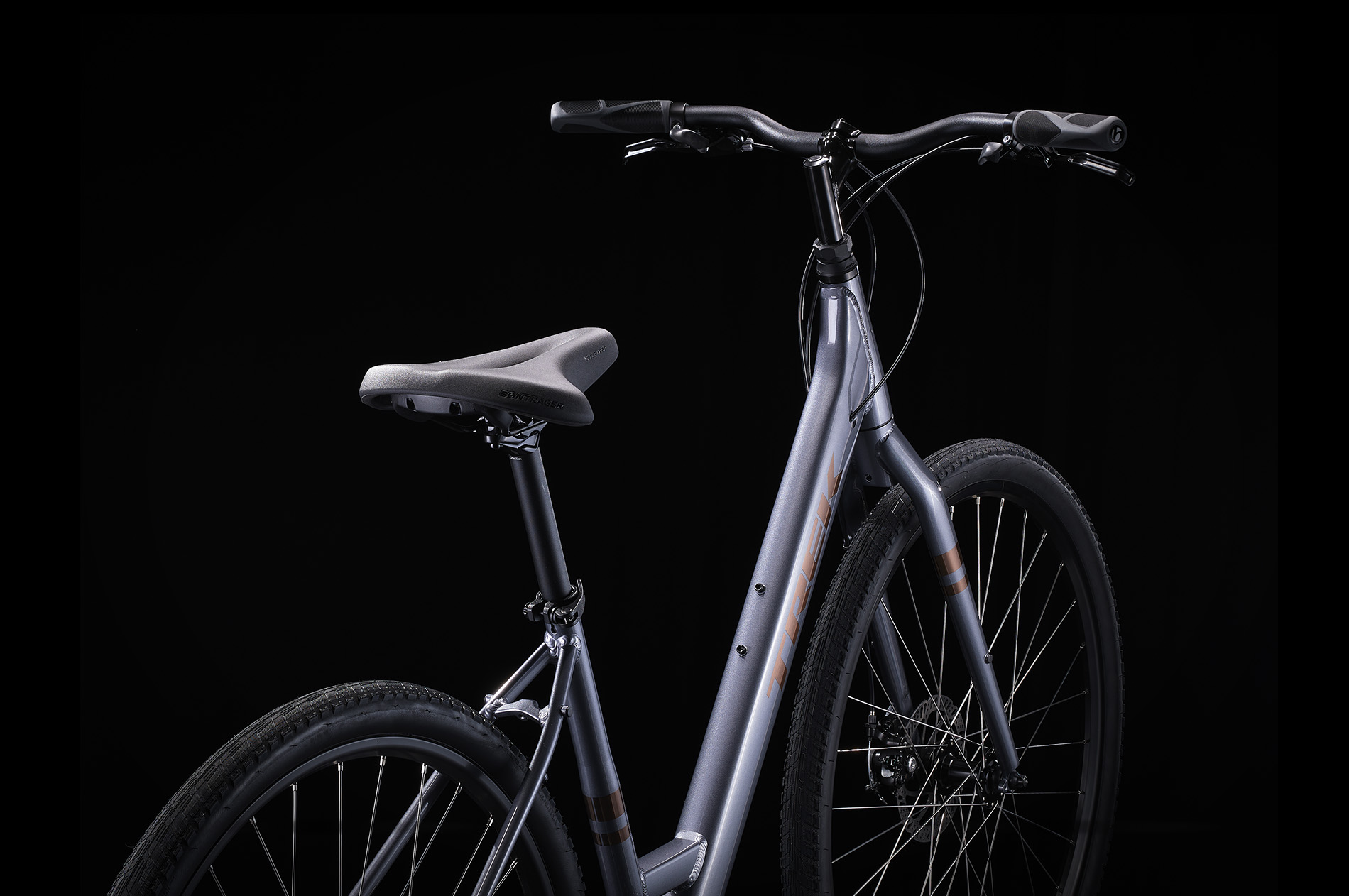 Một khung hợp kim nhôm Alpha Aluminum nhẹ nhàng và bền bỉ, với thiết kế khung võng xuống để dễ lên xuống xe, kèm theo nhiều ngàm phụ kiện, từ vè xe đến baga sau. Hệ thống truyền động Shimano 21 tốc độ để bạn không bao giờ phải quá gắng sức khi leo dốc, hệ thống thắng đĩa mạnh mẽ, bộ cổ điều chỉnh được góc độ, một yên xe Bontrager rộng rãi êm ái, vỏ xe cỡ lớn 45c bám đường và cấu trúc hình học giúp ngồi thẳng lưng để tạo ra trải nghiệm đạp xe thoải mái hơn bao giờ hết.